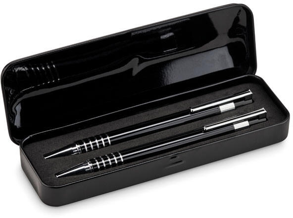 Alumínium íróeszköz készlet. Tartalma: kéken író golyóstoll és mechanikus ceruza. Hozzáillő fém dobozban.