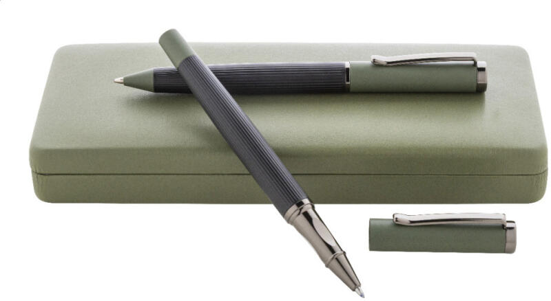 Elegáns, fém golyóstoll és rollertoll szett csíkos testtel, színes díszítőelemekkel és fényes fegyverfém részletekkel. Színben hozzáillő ajándékdobozban, kék tollbetéttel. André Philippe márkatermék.