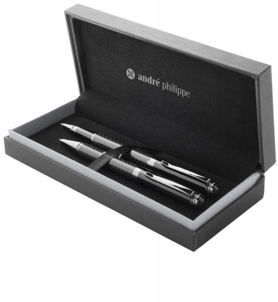 Elegáns, fém golyóstoll és rollertoll szett karbon testtel. Fekete díszdobozban, kék tollbetéttel szállítjuk. André Philippe márkatermék. Szín: fekete Anyag: Fém Méret: 175×51×23 mm Termék tömege: 236 g Toll típus: Golyóstoll - Rollertoll Újratöltő színe: Kék