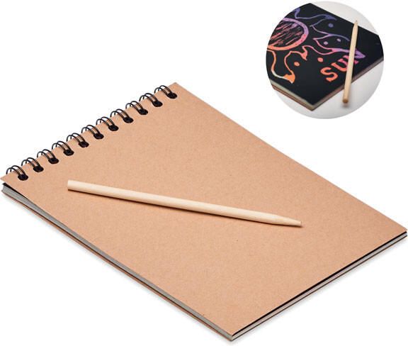 Gyűrűs kraft papír képkarcoló füzet, 10 fekete, újrahasznosított papírból készült képkarcoló lapot és fatollat tartalmaz.