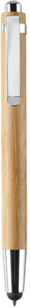 Nyomógombos bambusz golyóstoll fém csíptetővel, érintőheggyel. Kéken író betéttel. A bambusz természetes anyag, színében, mintázatában és méretében esetenként eltérő lehet.