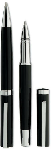 Sárgarézből és rozsdamentes acélból készült tollkészlet díszdobozban. Csavarzáras golyóstoll kéken író, illetve roller toll feketén író betéttel.