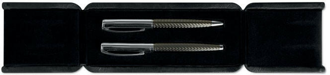 Toll szett ajándékdobozban. Sárgaréz csavarmechanikás golyóstoll és roller toll. Kéken, illetve feketén író betéttel.