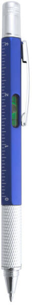Műanyag golyóstoll fém klipsszel, csillag és laposfejű csavarhúzóval, vízmértékkel és 7 cm-es vonalzóval. Kék tollbetéttel szállítjuk.