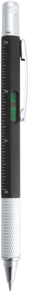 Műanyag golyóstoll fém klipsszel, csillag és laposfejű csavarhúzóval, vízmértékkel és 7 cm-es vonalzóval. Kék tollbetéttel szállítjuk.