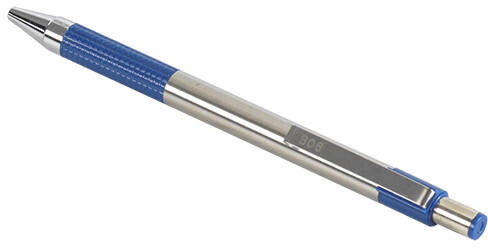 Nyomógombos golyóstoll rozsdamentes acél tolltest. Bordázott markolat. Markolat színek kék. Tintaszín: kék. Golyóátmérő: 0,7 mm, írásvastagság 0,24 mm. Betét: F. 50db/gyűjtő, 1000db/karton. 49421 Katalóguskód: 1446