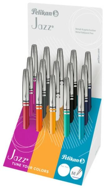 Jazz Classic golyóstoll, nemes ívek és klasszikus színek találkozása. Írásszíne kék, anyaga fém, csavarmechanikával működik, rugós klip, cserélhető betétes (pl: Pelikan 337), tamponnyomással feliratozható és gravírozható. 15 db toll/display, vegyes színekkel.