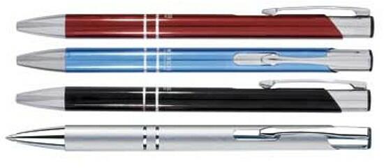 Fém nyomógombós golyóstoll, vonalvastagság: 0.7 mm, az írás színe: kék, 2 gyűrűs, a tolltest színe választható: ezüst, kék, fekete, bordó