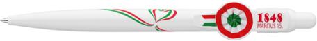 Magyar nemzeti motívumokkal díszített nyomógombos mechanikával működő golyóstoll 0,8 mm-es kék színű X-20as golyósbetéttel. Vonalvastagság: 0,8 mm. Íráshossz: 2500 m. 10 db/csomag Katalóguskód: 54795