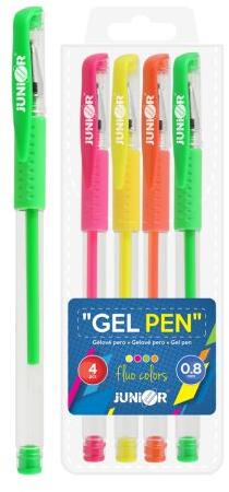 Átlátszó műanyag testű, egyszínű gumi markolattal és kupakkal ellátott FLUO zselés toll készlet az utántöltő színében, 4db csomagban.