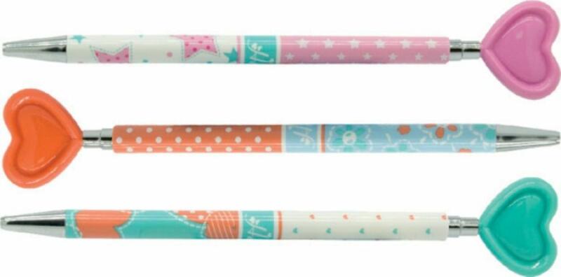Műanyag, mintás tolltest, nyomógombos szerkezet. Műanyag, szív alakú nyomógomb, fém írócsúcs.
