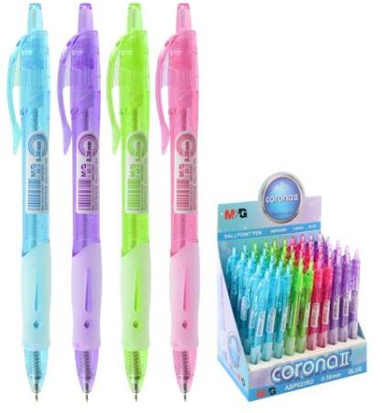 Masszív műanyagból készült golyóstoll gumi markolattal. Kúpos tollhegy 0,38 mm, különböző színek keveréke. Cserélhető B-38 kék színű patron - kód: 0574 B.