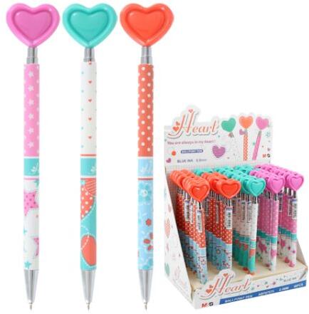 Golyóstoll műanyag testtel és kék "szív" töltettel. Kellemes tapintású, sima és lágy írás. A hegy átmérője 0,5 mm. 3 különböző kivitelben, szíves rátéttel. Cserepatron: 0512