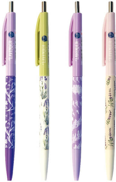 Levendula mintás, vékony tolltestű golyóstoll. A nyomógombos toll műanyag klippel rendelkezik. Golyóátmérő: 0,38 mm. Kéken ír.