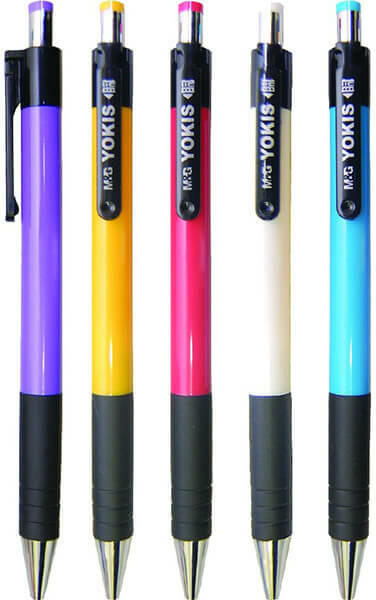 M&G márkájú nyomógombos golyóstoll műanyag tolltesttel és klippel. Fogórésze gumírozott, bordás, így kényelmes fogású és nem csúszik.