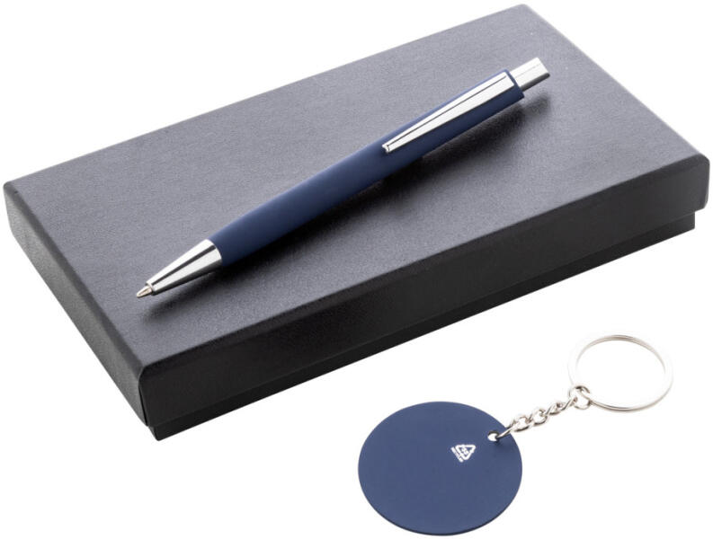2 részes ajándékkészlet fekete papír díszdobozban. Tartalmazz egy újrahasznosított alumínium golyóstollat ?gumírozott bevonattal és kék tollbetéttel, valamint egy újrahasznosított rozsdamentes acél kulcstartót gumírozott felülettel. Mindkét elem speciális bevonattal rendelkezik a tükörgravírozáshoz.