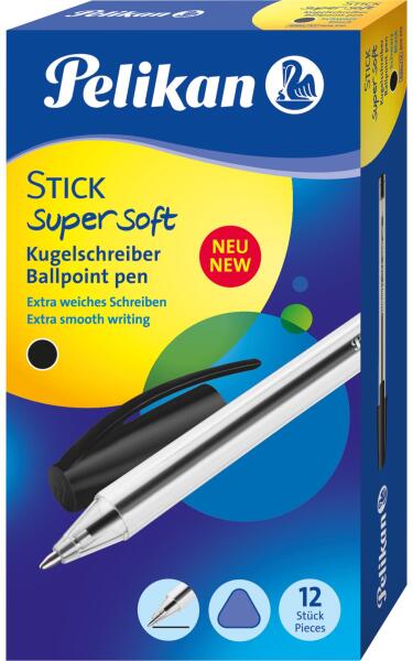 Pelikan Tollkészlet, 12 db, Stick super soft, Fekete tinta Jellemzők:Egyszerű eldobható toll;Átlátszó műanyag test és a tinta színével megegyező csíptethető kupak;Kartondobozba csomagolva;A toll súlya: 8 g;12 darabos készlet.