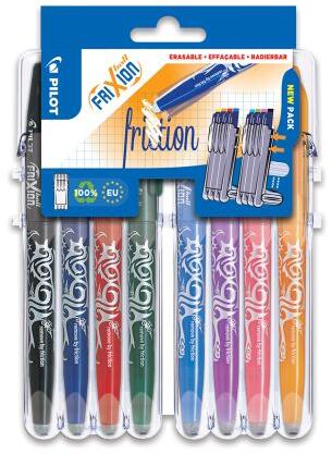 8 db újraírható görgős készlet folyadéktöltéssel a vezető japán gyártótól, a Pilottól. A FriXion egy ideális termék, nem csak iskolásoknak készült, az írott szöveg ugyanoda törölhető és újraírható, ahányszor csak akarja. Színek: fekete, kék, piros, zöld, égszínkék, lila, korall rózsaszín, sárgabarack narancssárga - Közepes hegy (M)