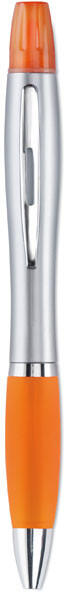 2 az 1-ben műanyag golyóstoll és szövegkiemelő ezüst szatén kivitelben, krómozott szerelvényekkel. Kéken író betéttel.