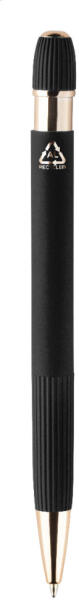 Újrahasznosított alumínium golyóstoll gumírozott testtel és rózsaarany részletekkel. Speciális bevonattal a tükörlézeres gravírozáshoz rózsaarany színben. Kék tollbetéttel.