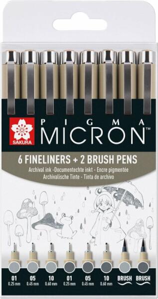 Ez egy automatizált szoftver általi fordítás:Ez a készlet 8 finomítót tartalmaz: Pigma Micron 01 (0,25 mm), Pigma Micron 05 (0,45 mm), Pigma Micron 10 (0,60 mm) és Pigma Brush - világosszürke és sötétszürke színben. Ezekkel a szürkeárnyalatokkal árnyékolást, mélységet, vizuális hangsúlyokat és rétegeffektusokat adhat az illusztrációkhoz, rajzokhoz és egyebekhez. A Pigma Micron egy vízálló és tartós finliner, amelyet tervezők, tudósok, levéltárosok, képregénykészítők, karikaturisták, illusztrátorok és rajongók használnak. Alkalmasak zentangle rajzolására is. A finom hegynek köszönhetően ezek a tollak ideálisak műszaki és művészi rajzok készítéséhez. Az egyedülálló Sakura Pigma tinta nem szivárog át a papíron, tartós, vízálló, fakulásálló, gyorsan szárad és pH semleges.