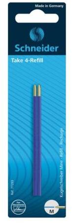 Schneider Take 4 Refill for Take 4 golyóstoll, kék színű. utántöltő a Take 4 4 színű golyóstollhoz a szabadalmaztatott Viscoglide® technológia biztosítja a sima és csúszó írást patron dokumentációs tintával hegy vastagsága M szín: az Ön választása szerint csomagolás: buborékfólia - 2 db egy színben