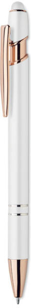 Újrahasznosított alumínium érintőhegyes golyóstoll rózsaarany részletekkel. Kéken író betéttel.