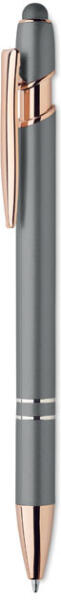 Újrahasznosított alumínium érintőhegyes golyóstoll rózsaarany részletekkel. Kéken író betéttel.