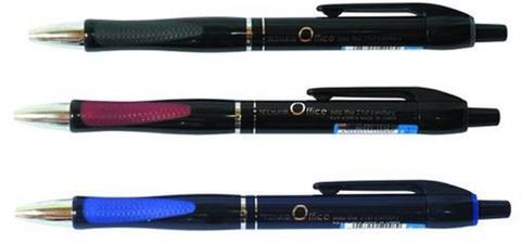 Műanyag, gumis fogós, nyomógombos golyóstoll. Cserélhető betétes: X-18