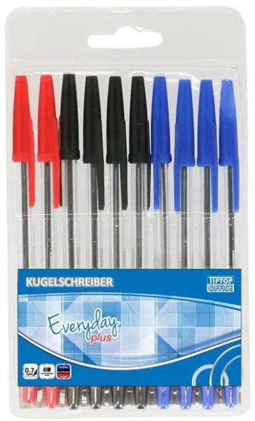 Iskolai, irodai és otthoni használatra is remek választás ez a golyóstoll szett, mely klasszikus formavilággal és három különböző színnel érkezik. A műanyag tárolóban összesen 10 db golyóstoll kapott helyet, melyek között 4 db kék, 4 db fekete és 2 db piros tintával töltött tollat találunk. A tollak a tintaszínnel megegyező kupakkal ellátottak, ami megvédi őket a sérülésektől és a kiszáradástól. A tollak 1 mm-es hegyvastagsággal rendelkeznek. Jellemzők:- praktikus tárolóban- klasszikus forma- vonalvastagság: 1 mm- íráshossz: 800 méter- színváltozatok: kék, fekete és piros