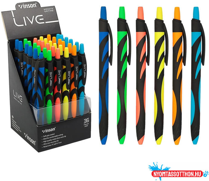 Vinson F20 Live nyomógombos, csúszásmentes gumírozott testű gyolyóstoll. A betét kék színű olajzselés tintát tartalmaz, mely könnyű gördülékeny írást tesz lehetővé. Nem cserélhető betétes. Vegyes neon színű külső testtel. Kiszerélés: 36 db/display.