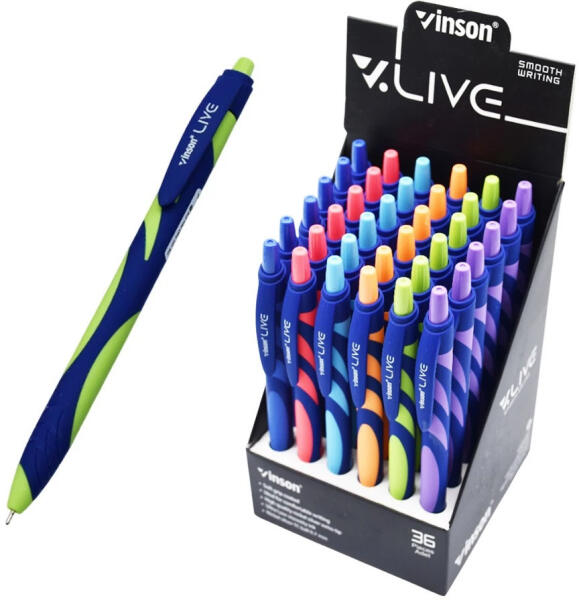 Vinson F20 Live nyomógombos, csúszásmentes gumírozott testű golyóstoll. A betét kék színű olajzselés tintát tartalmaz, mely könnyű gördülékeny írást tesz lehetővé. Nem cserélhető betétes. Vegyes neon színű külső testtel. Kiszerélés: 36 db/display.