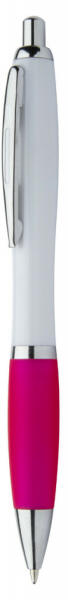 Műanyag golyóstoll fehér testtel, színes markolattal, fényes króm részekkel. Kék tollbetéttel szállítjuk.