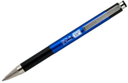 Zebra márkájú, rozsdamentes alumínium testű, bordázott markolatú golyóstoll. Kényelmes fogású. Írásvastagság: 0,24 mm. Golyóvastagság: 0,7 mm. Kék betéttel, kéken ír. Szín: kék tolltest. Hegye behúzható.